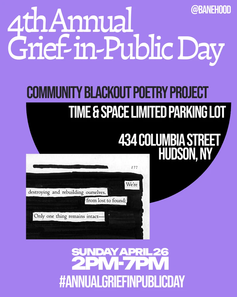 Join us for a free community art project in the Time & Space Limited parking lot. Participants will create a poem from used book pages in the style of blackout poetry, expressing grief and contributing to a collection of poems on display, sharing the experience with one another.